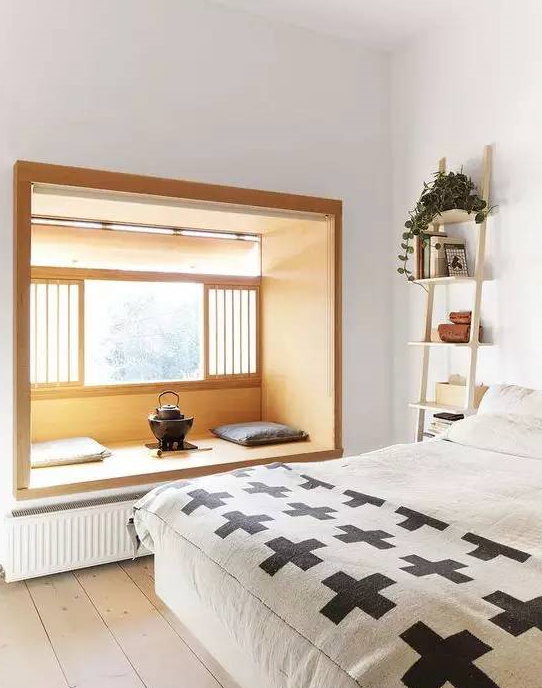 非常日式的飄窗、亞麻床品散發(fā)著自然、悠閑的味道。