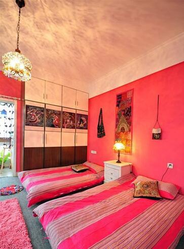 大面積粉紅色的臥室墻面,是主人強烈熱烈脾氣的完美表現(xiàn),在陽光的暉映下,紅色看上去加倍光彩熠熠。房主特意挑選的異域風味濃厚的床品是不錯的點綴,窗邊的小圓凳也十分搶眼。